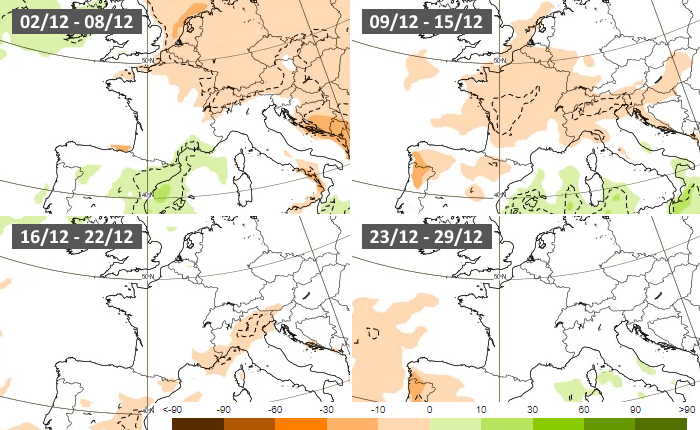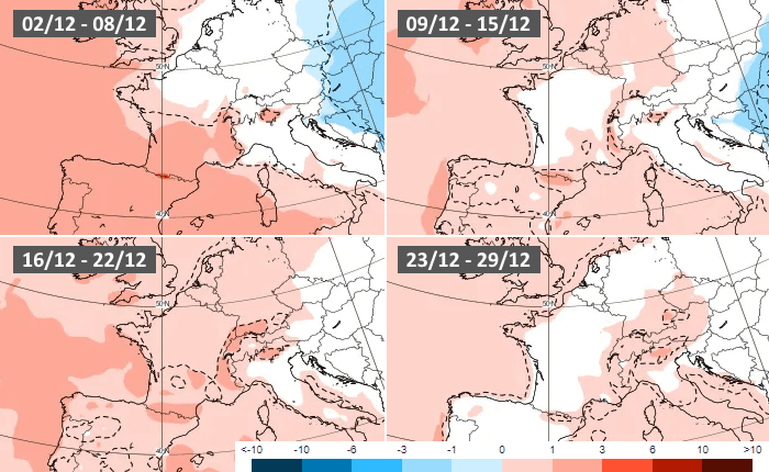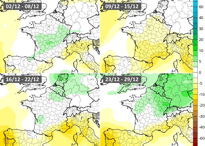 Le modèle européen propose un début de mois de décembre humide aux abords du golfe du Lion mais sec au nord. Puis, la semaine du 9 au 15 décembre serait globalement calme, validant l'option de son homologue américain. En revanche, il ne dégage aucune tendance franche pour la deuxième moitié du mois de décembre, ce qui laisserait ouvert le champ des possibles.