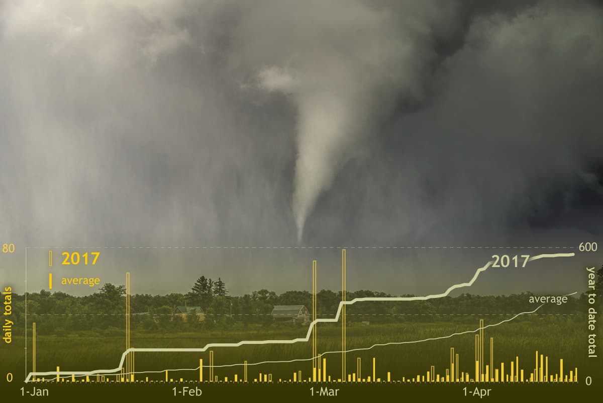 Si des tornades sont possibles tout au long de l'année sur les États-Unis, les conditions sont bien plus favorables entre avril et juin sur les grandes plaines, avec des conflits de masses d'air que nous venons d'évoquer. Des situations orageuses très dynamiques et récurrentes. Ainsi, c'est durant le mois de mai que le nombre moyen de tornade est le plus important sur le pays.