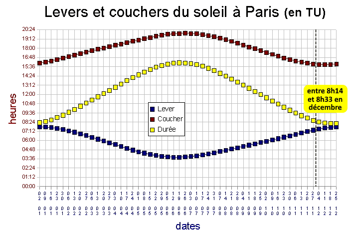 Durée du jour à Paris au cours de l'année (en temps universel)