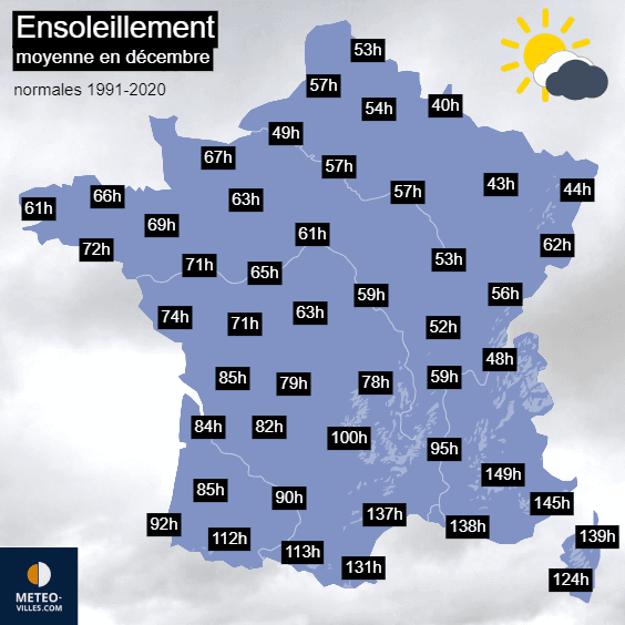 Le mois de décembre est tout simplement le moins ensoleillé de l'année en France. Au cours de ce dernier, le soleil ne brille que 40 heures en moyenne à Charleville-Mézières dans le Ardennes, 43 heures à Nancy ou encore 44 heures à Strasbourg. Pour la capitale alsacienne, c'est près de 5,5 fois moins qu'au cours du mois de juillet (moyenne de 240 heures) ! À Paris, le soleil brille 57 heures en moyenne en décembre. C'est à peine mieux à Lyon avec 59 heures. C'est seulement en montagne et en Méditerranée que l'on dépasse les 100 heures (jusqu'à 145h à Nice).