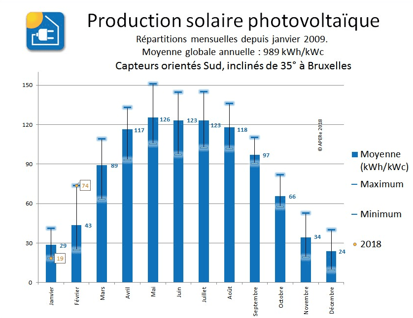 Production photovoltaïque moyenne par mois entre 2009 et 2018 à Bruxelles - via renouvelle.be