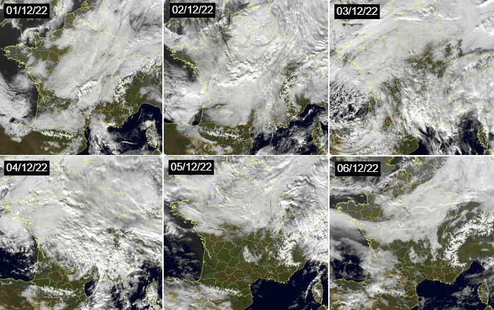 Depuis la fin du mois de décembre, les nuages bas sont très nombreux sur la moitié nord de la France où le soleil a très peu - voire pas du tout - brillé. Sur les images satellite ci-dessous, on constate cette véritable "tartine" de grisaille présente entre le 1er et le 6 décembre 2022 sur de nombreuses régions de la moitié nord. C'est entre les régions centrales et le nord-est que le ciel est resté le plus gris, si bien que certaines villes n'ont toujours pas vu le soleil depuis le début du mois !