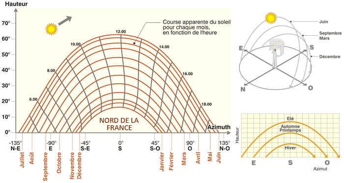 Hauteur du soleil dans le ciel au cours de l'année pour le nord de la France - via energieplus-lesite.be