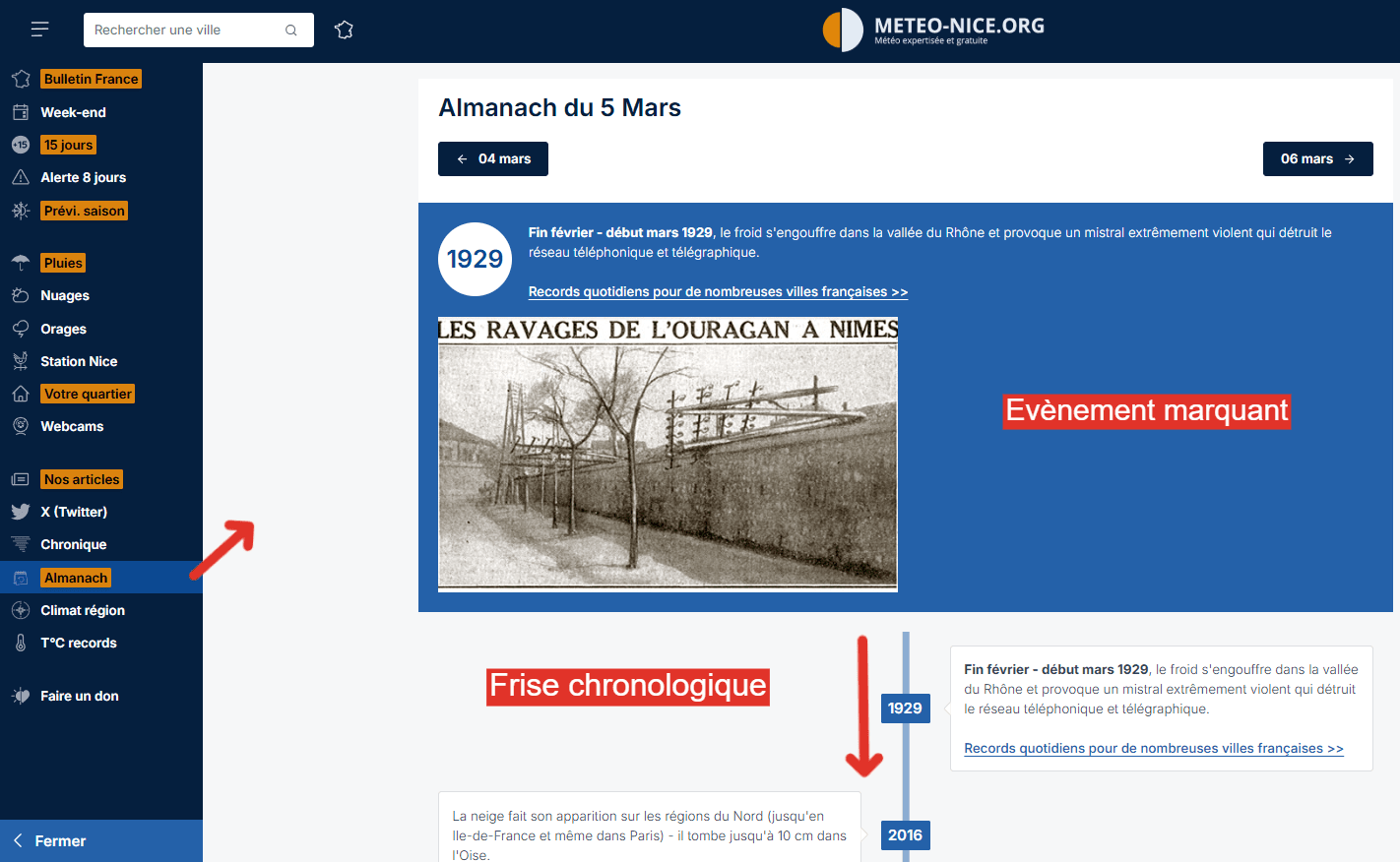 En parlant d'atout, connaissez vous notre Chronique meteo depuis 1850 et notre Almanach ? Cette base de données unique en France sur internet est particulièrement détaillée et mise à jour tout au long de l'année. Si vous souhaitez vous replonger dans le temps français du passé ou même simplement savoir quel événement météo a pu marquer l'actualité à votre date d'anniversaire, vous trouverez toutes vos réponses dans cette base de données, qui a d'ailleurs également pu servir pour un certain nombre d'ouvrages et d'articles liés à la météo et au climat français tant celle-ci est complète.