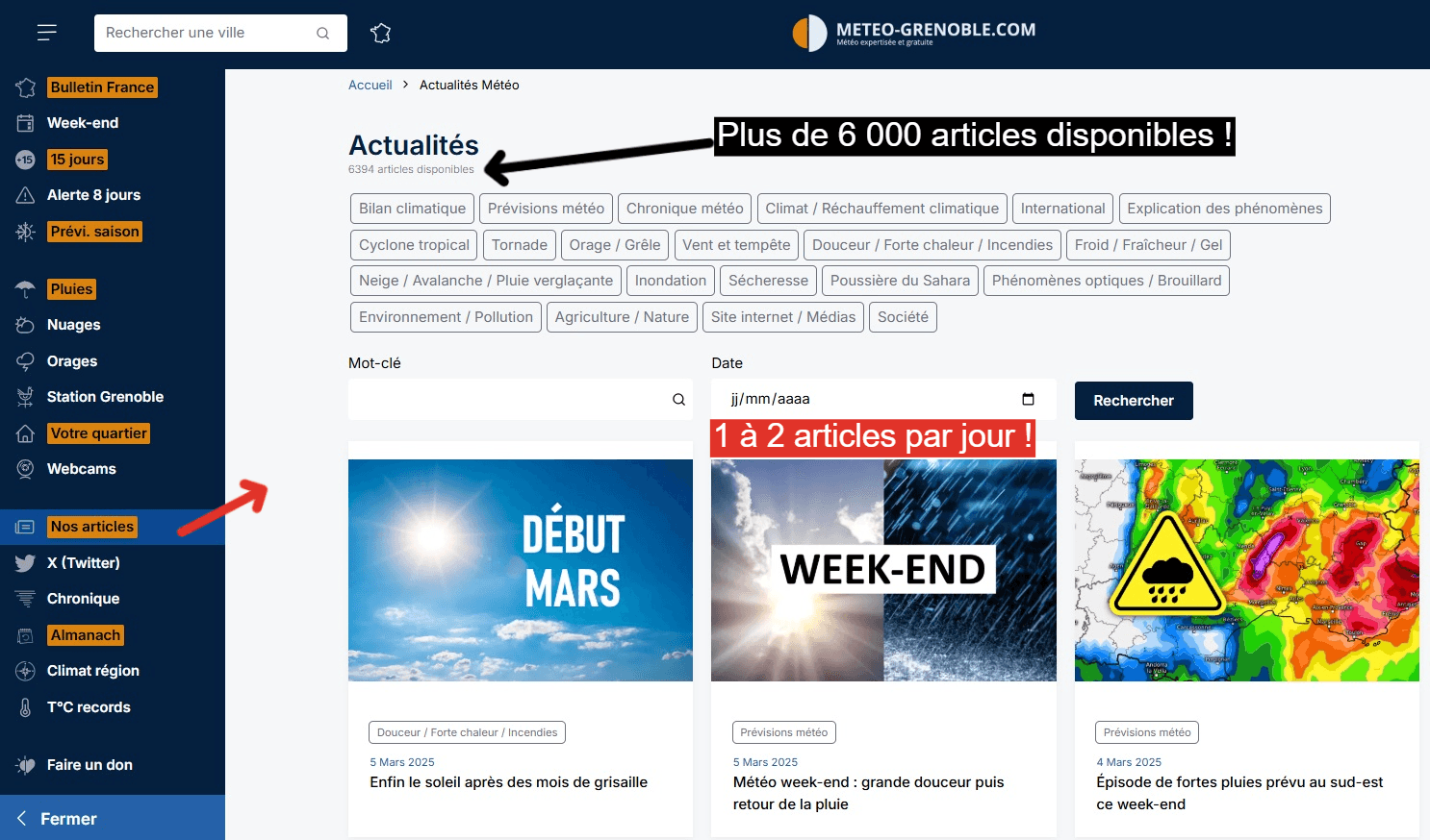 Sous le suivi météorologique, vous trouverez également des liens vers nos articles, rédigés chaque jour par nos prévisionnistes et étant l'un des atouts de Météo-Villes. Ces derniers s'intéressent en premier lieu à l'actualité météo du moment mais nous ne nous arrêtons pas là. Nous essayons aussi d'ouvrir le débat sur le changement climatique et ses conséquences afin de proposer des articles aux sujets variés que nous ne voyez pas ou peu ailleurs. Météo en France et dans le monde, bilan climatiques, explications de phénomènes météo, évolution du climat... plus de 6.000 sujets sont consultables sur notre site !