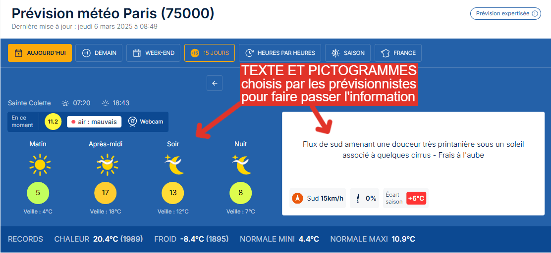 La prévision météo c'est aussi de la communication, et cette synthèse est effectuée par nos météorologues dont le métier est également de faire passer l'information la plus pertinente possible en utilisant un langage adapté au grand public (ici, le texte rédigé par nos prévisionnistes et les pictogrammes choisis afin d'être le plus proche du scénario que nous avons envisagé).