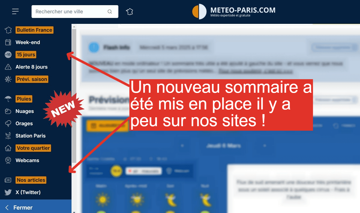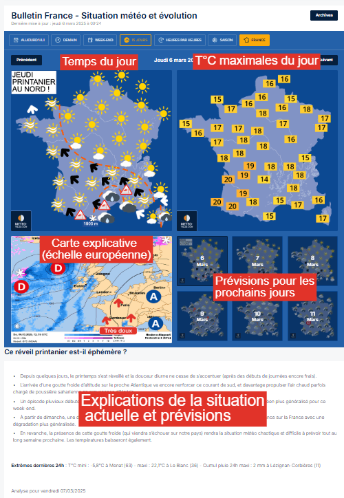 Ce nouveau sommaire, accessible uniquement sur ordinateur, est divisé en plusieurs catégories, présentant d'abord les liens vers les prévisions météorologiques, des prévisions expertisées chaque jour se montrant ainsi particulièrement fiables et se démarquant surtout des prévisions automatisées de la plupart des autres sites de prévisions météorologiques disponibles sur internet.