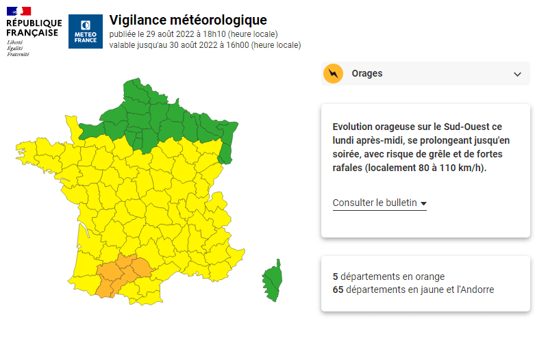 Météo France a placé les Hautes-Pyrénées, le Gers, la Haute-Garonne, le Tarn et le Tarn-et-Garonne en vigilance orange aux orages pour cette soirée du lundi 29 août 2022 (jusqu'à 22h). Par ailleurs, 65 autres départements sont en vigilance jaune, valable la nuit prochaine et en journée du mardi 30 août 2022. Seules les régions les plus au nord échappent à cette instabilité, associée à un petit talweg circulant sur le golfe de Gascogne et générant des foyers orageux non-généralisés mais ponctuellement forts.