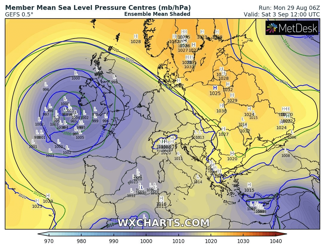 Différentes modélisations de la position de la dépression atlantique pour le samedi 3 septembre 2022 - via wxcharts.com
