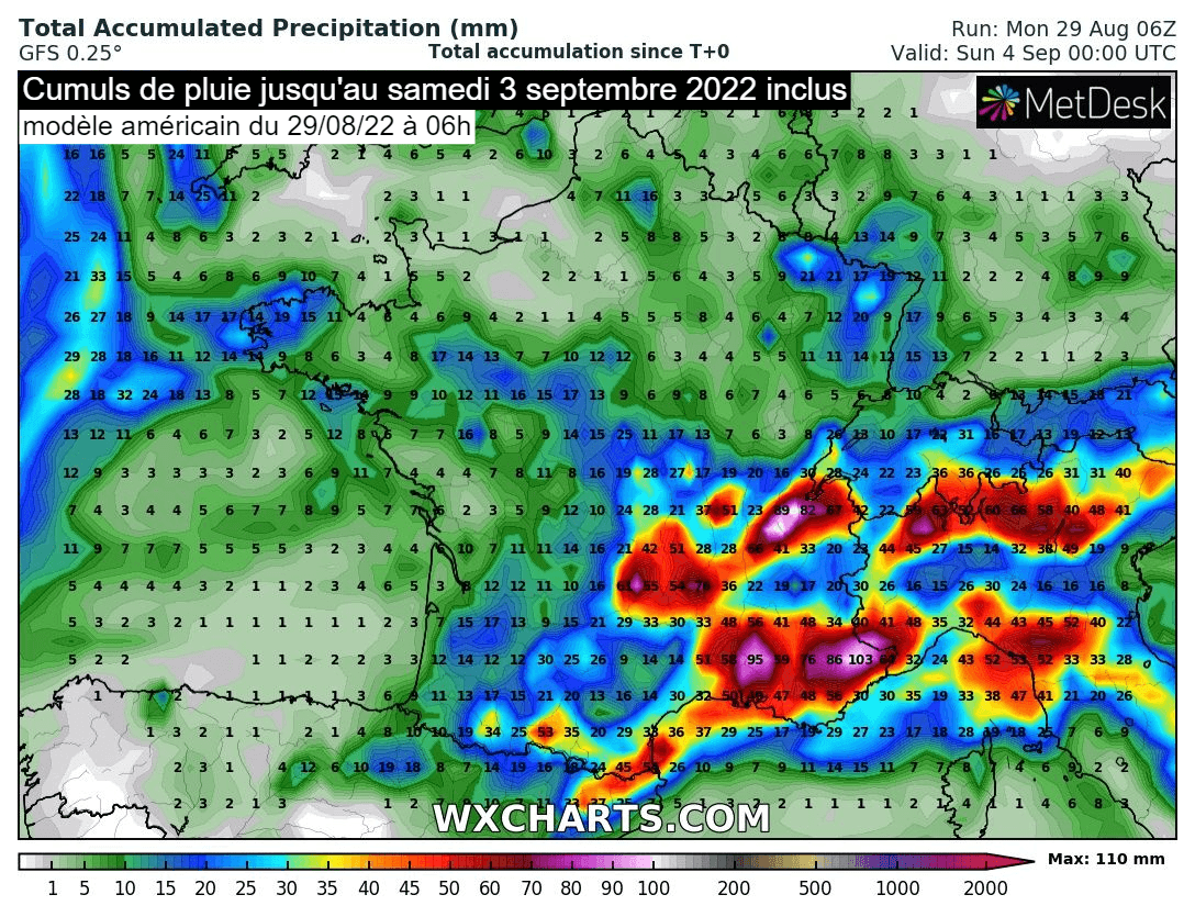 Cumuls de pluie jusqu'au samedi 3 septembre 2022 inclus - modèle américain via wxcharts.com
