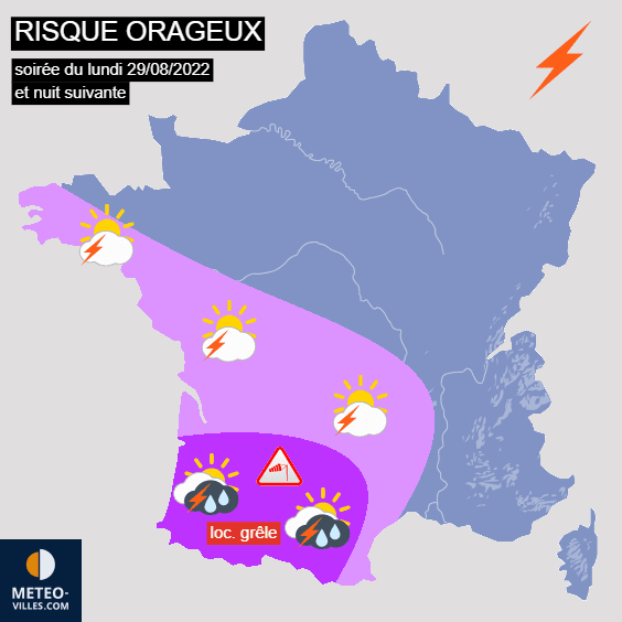 En cette fin de journée du lundi 29 août 2022, de forts orages se sont déclenchés sur le sud de l'Aquitaine. Ces derniers vont progresser vers l'est en direction de l'ancienne région Midi-Pyrénées, pouvant s'accompagner de fortes pluies mais aussi plus localement de chutes de grêle et de bourrasques de vent susceptibles d'atteindre 80 à 100 km/h. En marge, des orages locaux seront possibles dans la nuit du Massif Central jusqu'à la pointe bretonne.