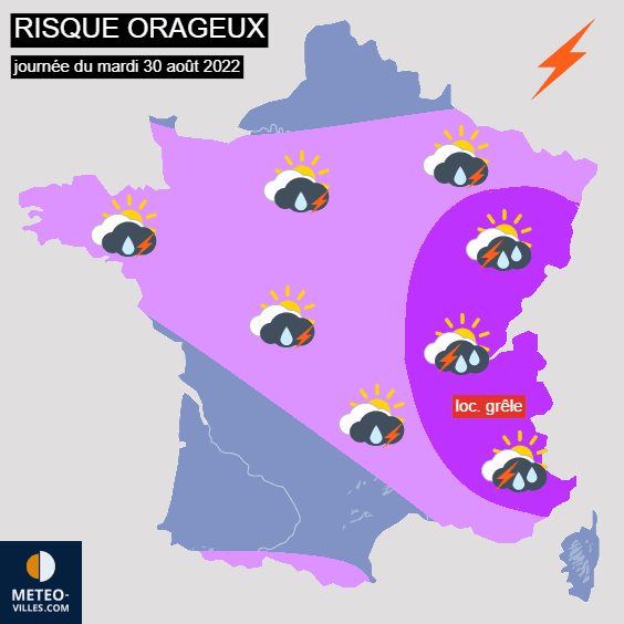 Ce mardi 30 août 2022, le risque orageux se décalera vers les régions de l'est. Quelques averses orageuses désorganisées pourront circuler du nord-ouest aux régions centrales mais c'est dans l'est du territoire que le risque orageux sera le plus net en cours d'après-midi et début de soirée. Des Vosges aux Alpes, les orages pourront être localement forts en générant d'intenses averses ponctuellement mêlées de grêle.