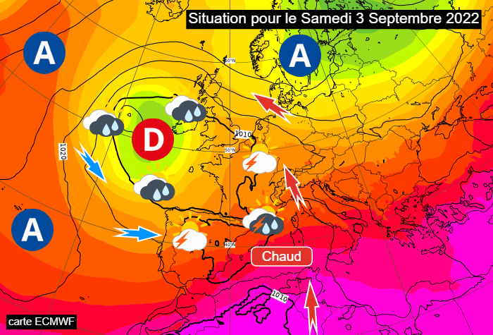 Passé cet intermède plus stable du milieu de semaine, l'instabilité devrait de nouveau se renforcer vendredi 2 et samedi 3 septembre 2022. En cause, la plongée d'une dépression nord-atlantique vers l'Irlande, venant se positionner au large de nos côtes atlantiques. Ainsi, la France sera soumise à un flux de sud-est qui fera remonter de l'air chaud mais la proximité de ces basses pressions déstabilisera la masse d'air avec une nouvelle accentuation du risque orageux. Près de la Méditerranée, ce flux de sud-est chaud et humide fait craindre un épisode fortement perturbé.