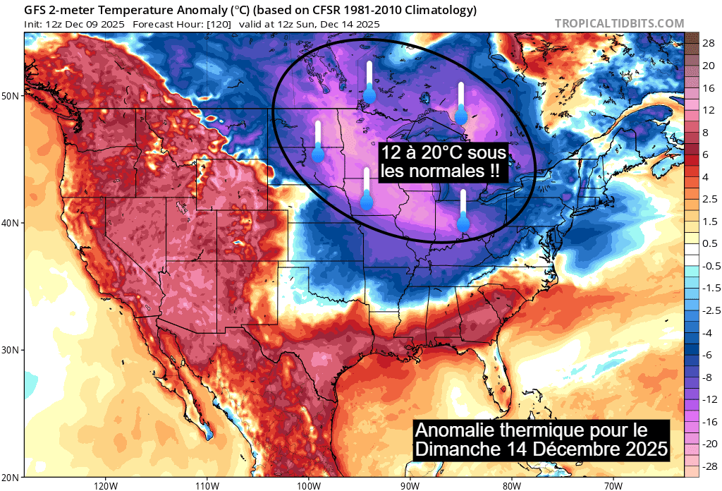 Il ne fait pas beaucoup plus chaud dans le nord du continent américain et particulièrement au Canada, où l'hiver a débuté sur les chapeaux de roue. Ces dernières heures, le thermomètre s'est abaissé sous les -40°C dans de nombreuses localités des Territoires du Nord-Ouest. On a pu mesurer jusqu'à -46,5°C sur la Dempster Highway et -44,7°C à Fort Good Hope ! Et ce froid glacial est loin d'être terminé puisqu'une nouvelle coulée polaire se prépare pour la fin de semaine sur le Canada et le nord-est des USA. Ce dimanche 14 décembre 2025, on attend -25°C à Minneapolis et -30°C dans le Dakota du Sud !