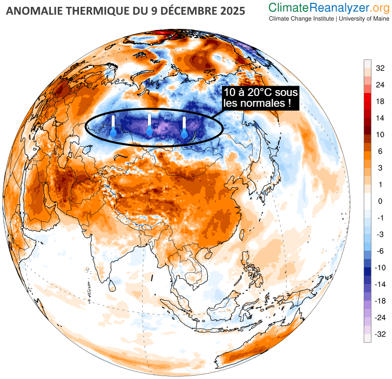 Pourtant, certaines régions de l'hémisphère nord enregistrent des anomalies opposées. C'est particulièrement le cas de la Sibérie en Russie. De vastes zones sibériennes connaissent depuis la fin novembre un froid particulièrement mordant. Actuellement, le thermomètre plonge à des niveaux 10 à 20°C inférieurs aux normales saisonnières en Sibérie centrale ! Ainsi, on a pu relever jusqu'à -54,3°C à Kerbo, valeur la plus basse en Russie depuis le début de la saison. On peut noter aussi les -51°C de Strelka-Chunya qui constituent la plus basse valeur mesurée en décembre depuis 23 ans !