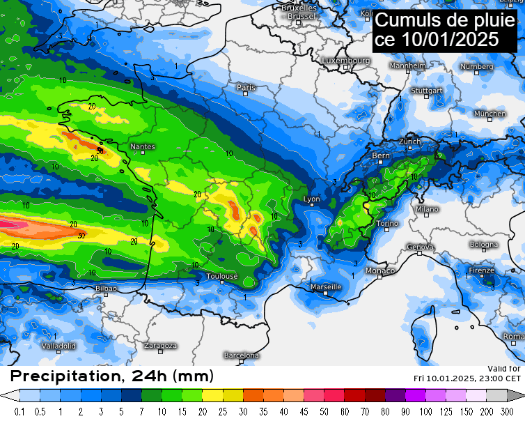 Des régions de l'ouest vers le centre, il faudra surveiller de nouvelles précipitations copieuses. On attend souvent 10 à 20 mm, ponctuellement 30 mm, venant s'ajouter aux pluies abondantes des derniers jours (parfois plus d'un mois de pluie en quelques jours). Ces cumuls vont aggraver la situation hydrologique, qui est devenue critique ce jeudi 9 janvier 2025 dans le nord-ouest de la France.