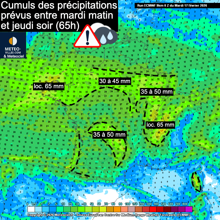 Cumuls de précipitations attendus entre mardi matin et jeudi soir – Modèle européen via Meteociel