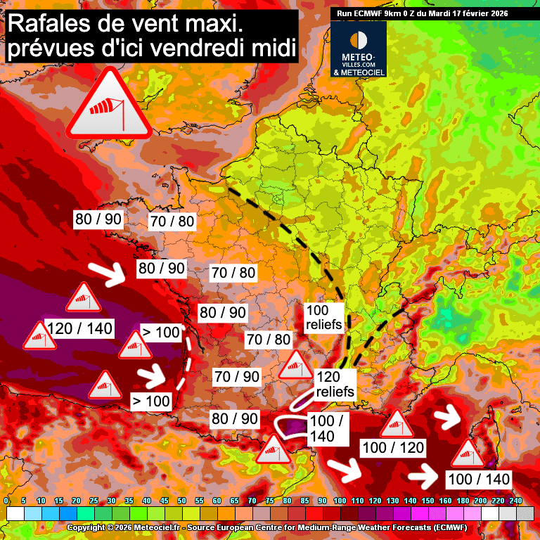 C'est donc notamment entre la façade Atlantique, le sud-ouest et les abords de la Méditerranée que les rafales les plus fortes sont attendues entre mercredi soir et jeudi avec parfois plus de 90-100 voire 140 km/h sur les secteurs les plus exposés. Ceci restera néanmoins à confirmer d'ici là.