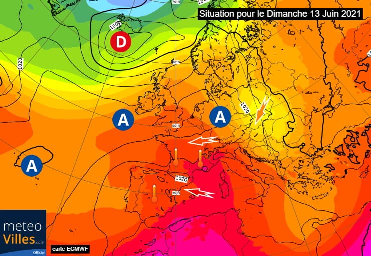 L'installation des conditions estivales est intimement liée au regonflement de l'anticyclone des Açores. Ce dernier, qui nous a boudé durant le mois de mai 2021, affirme de plus en plus son influence et s'étendra sur la France, l'Angleterre et la Mer du Nord d'ici la fin de la semaine. Les pressions dépasseront les 1025 hPa sur les régions du nord.