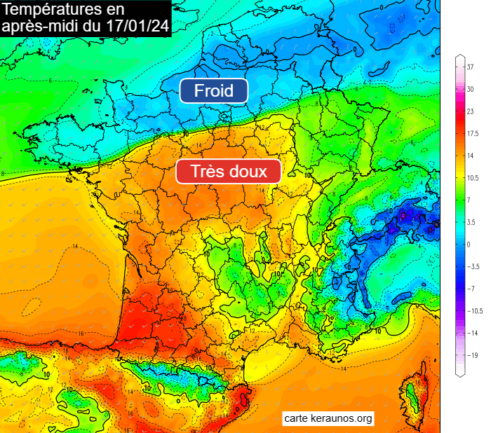 Températures prévues en après-midi du mercredi 17 janvier 2024 - via keraunos.org