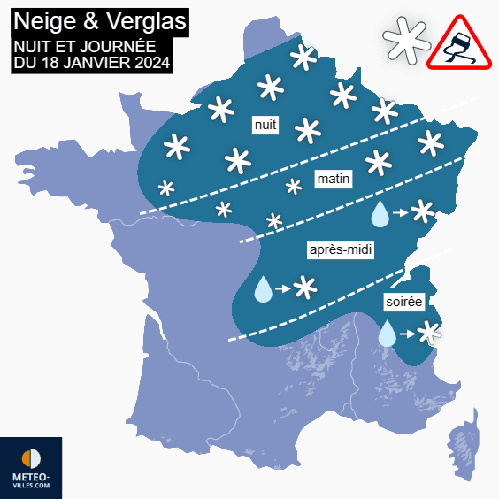 Avec le retour du froid par le nord, la neige devrait s'étendre du Nord-Pas-de-Calais vers la Normandie en soirée du mercredi 17 janvier 2024 puis c'est l'Île-de-France et le nord de la Champagne qui seront touchés dans la nuit de mercredi à jeudi. En matinée du jeudi 18 janvier 2024, l'épisode neigeux se décalera entre la Bourgogne et le Grand-Est puis entre le nord du Massif Central et les frontières de l'est en après-midi, terminant sa course sur les Alpes en soirée. Notons que le front perdra peu à peu en intensité en progressant vers le sud et l'est.