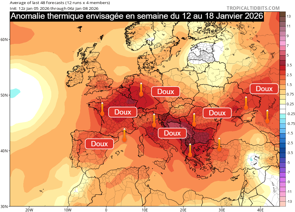 Anomalie thermique envisagée en semaine du lundi 12 au dimanche 18 janvier 2026 - tropicaltidbits.com