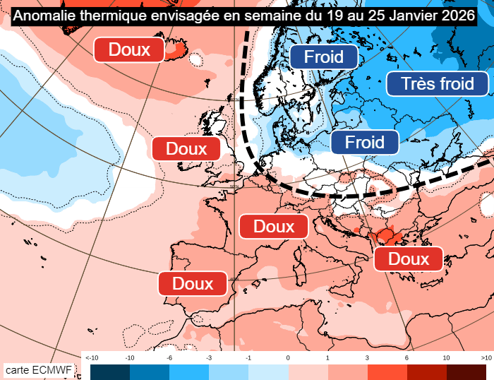 Ces derniers jours, plusieurs scénarios envisageaient un possible retour du froid après la mi-janvier 2026. Désormais, les scénarios allant dans ce sens se font bien rare et c'est la douceur qui prime sur notre pays. En effet, l'anomalie froide a été décalée vers le nord-est du continent, surtout entre la Scandinavie et la Russie. Sur l'ouest et le sud de l'Europe - dont la France - la semaine du lundi 19 au dimanche 25 janvier 2026 est désormais vue comme douce.