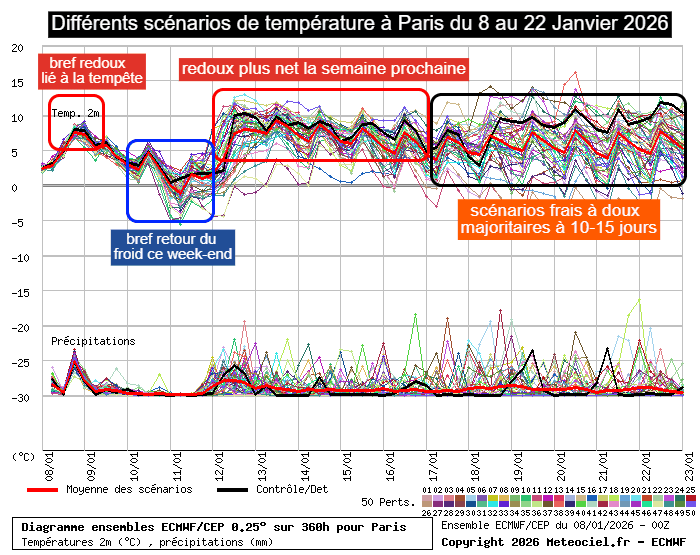 Différents scénarios de température à Paris du 8 au 22 janvier 2026 - meteociel.fr