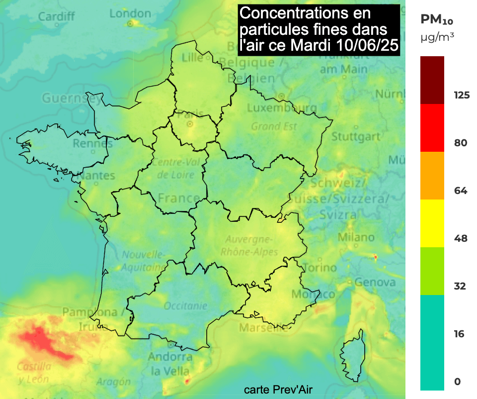 Concentrations en particules fines de pollution ce mardi 10 juin 2025 - Prev'Air