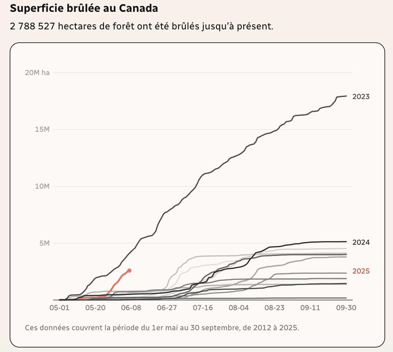 Même s'il n'y a pas de conséquence directe pour la santé en France car ces fumées ne circulent pas au sol, les causes doivent nous interpeller. En effet, la saison des incendies a débuté tambour battant au Canada. En ce début juin, plus de 2,7 millions d'hectares de forêt ont déjà été détruits dans le pays ! Un chiffre largement au dessus de la moyenne et qui arrive au second rang des pires années, juste derrière la catastrophique année 2023 où plus de 4 millions d'hectares avaient déjà brûlés à la même date.