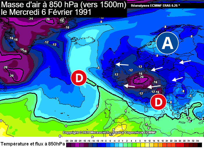 Masse d'air à 850 hPa (vers 1500m) le mercredi 6 février 1991 - meteociel.fr