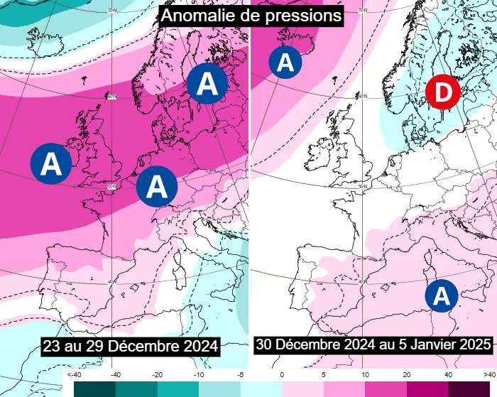 Anomalie de pressions du 23 au 29 décembre 2024 et du 30 décembre au 5 janvier 2025 - ECMWF