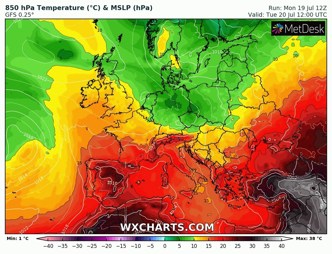 L'animation des masses d'air ci-dessus permet de mettre en évidence que les masses d'air très chaud présentes au dessus de la Méditerranée et de la péninsule ibérique remontent sur une large moitié sud de la France, jusqu'en Bretagne (valeurs de 15 à 20°C à 850 hPa soit vers 1500m d'altitude).