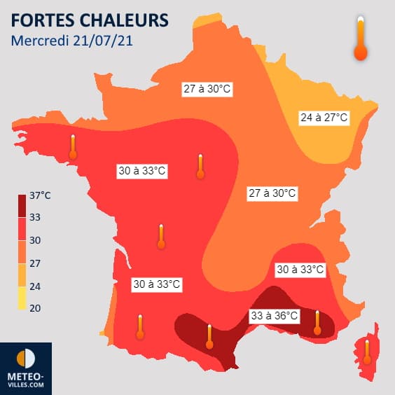 Températures maximales prévues le mercredi 21 juillet 2021 - Météo Villes