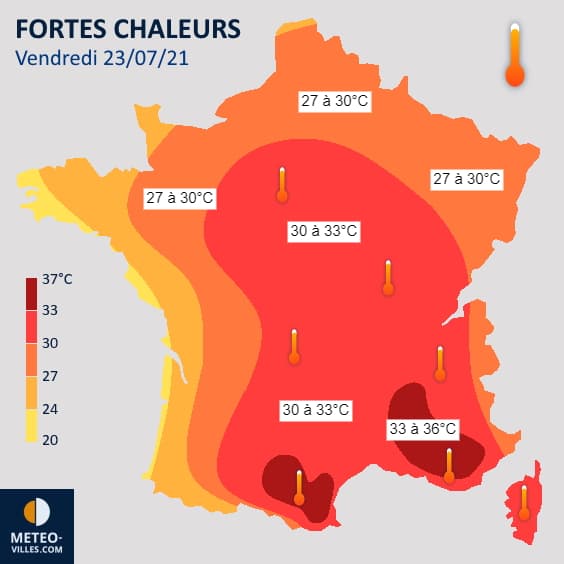 L'air océanique plus frais commencera à arriver par la façade atlantique dès la journée du vendredi 23 juillet. En revanche, les fortes chaleurs seront encore présentes sur le sud, le centre et l'est de la France où il fera souvent plus de 30°C. C'est vers l'intérieur de la Provence et la basse vallée du Rhône que sont attendues les valeurs les plus élevées, souvent de l'ordre de 33 à 36°C.