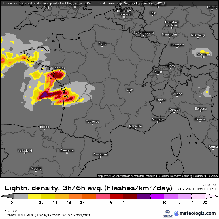 Modélisation de la densité de foudre du vendredi 23 au dimanche 25 juillet 2021 - via meteologix.com