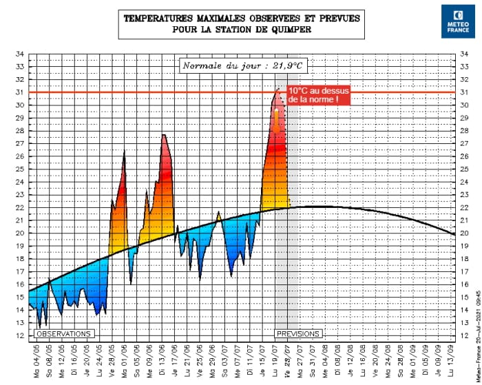 À Quimper, les températures ont dépassé les 30°C durant les après-midi du dimanche 18, du lundi 19 et du mardi 20 juillet 2021 et ce seuil sera très probablement dépassé également les mercredi 21 et jeudi 22 juillet. La préfecture du Finistère devrait ainsi connaître une série de 5 journées consécutives à plus de 30°C. Pour le secteur, il s'agit d'un événement remarquable, d'autant qu'il ne fait jamais moins de 18°C durant les nuits.