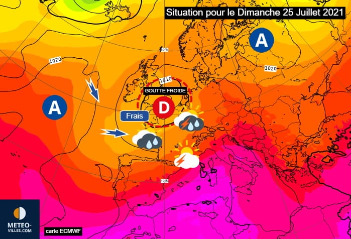 Comme nous l'avons évoqué plus haut, une énième goutte froide se rapprochera de la France en fin de semaine. Les différents scénarios s'accordent sur son arrivée au large de la Bretagne dès le vendredi 23 juillet 2021 avant que celle-ci ne survole le nord de la France au cours du week-end des 24 et 25 juillet. Cette dépression de petite échelle sera la sixième du même type à nous concerner depuis le début de l'été météorologique !