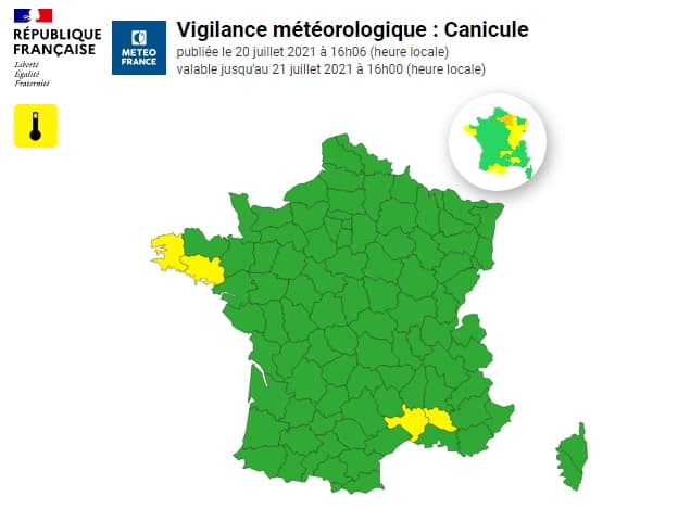 Carte de vigilance en vigueur le mardi 20 juillet 2021 pour le paramètre canicule - via Météo France