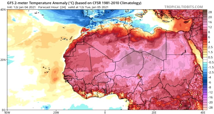 Anomalies thermiques sur le nord de l'Afrique ce mardi 5 janvier 2021 - via tropicaltidbits.com