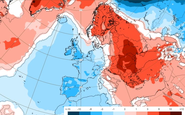 En revanche, ce système dépressionnaire et cet air froid sur l'ouest de l'Europe ont favorisé un flux de sud faisant remonter de l'air très doux pour la saison entres les Balkans et l'ouest de la Russie. Certaines régions de Bulgarie ou de Roumanie ont connu des anomalies thermiques supérieures à +6°C sur 7 jours.