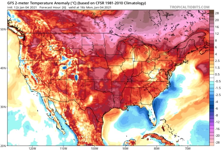 Anomalies thermiques aux États-Unis le lundi 4 janvier 2021 - via tropicaltidbits.com
