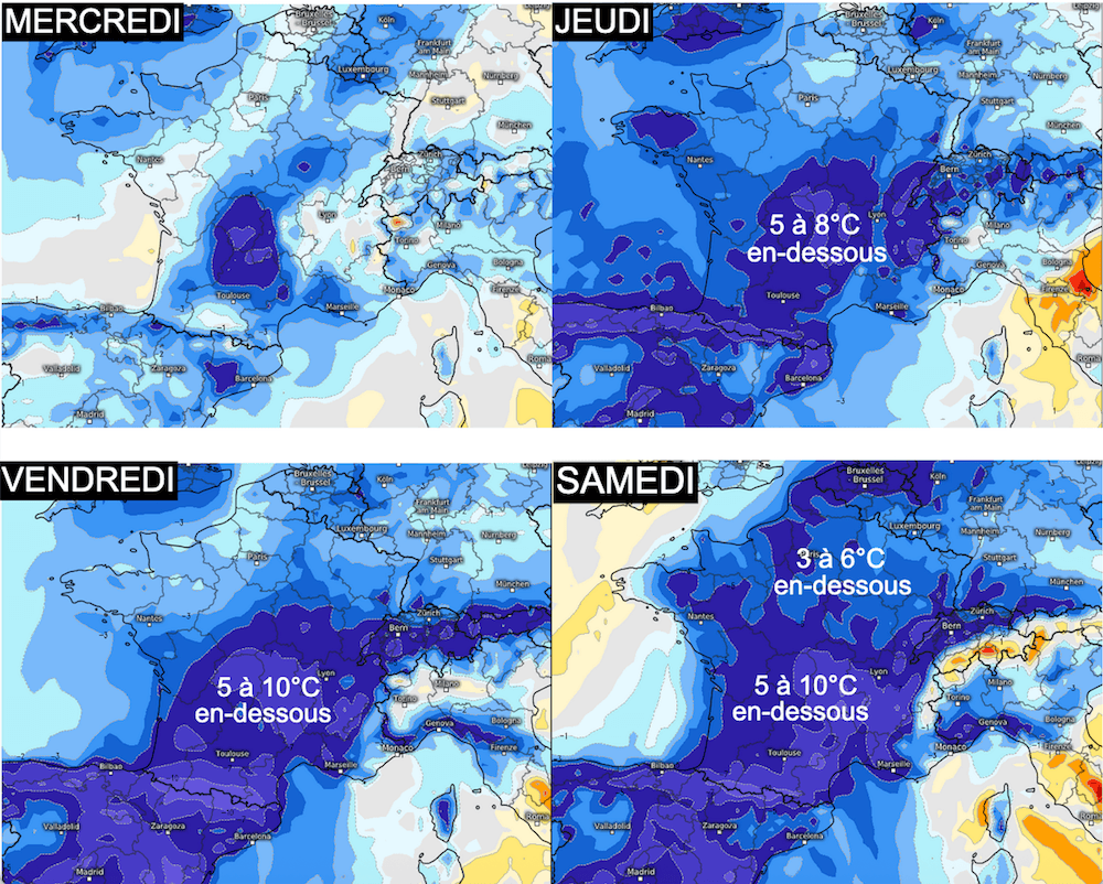 Le déficit thermique sera particulièrement prononcé des Pyrénées au Massif Central et à la Franche-Comté, où les températures pourraient atteindre, à la mi-journée, des valeurs inférieures de 8 à 10°C aux normales saisonnières.