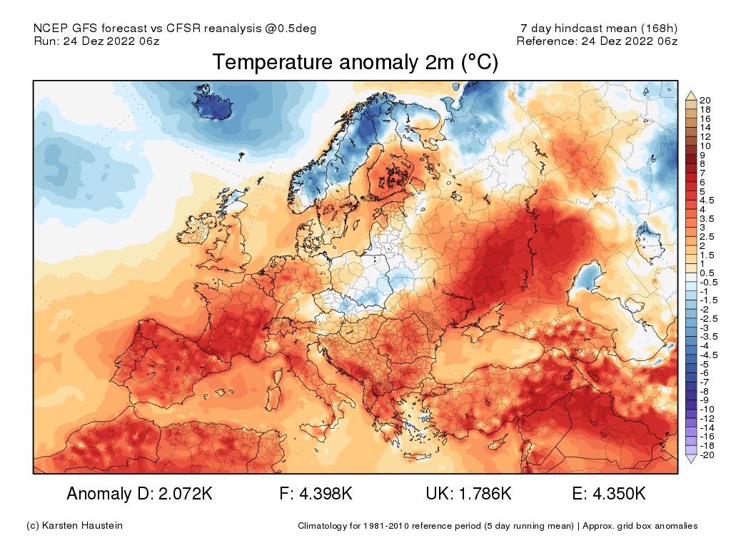 Modélisation de l'anomalie thermique en Europe du 24 au 31 décembre 2022 - via Karsten Hausten
