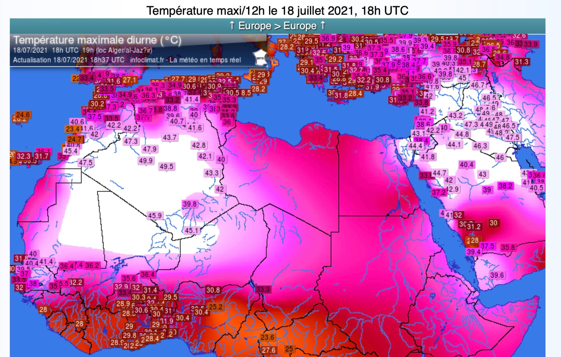 Températures maximales sur le Nord-Ouest de l'Afrique ce dimanche 18 juillet 2021 – Infoclimat