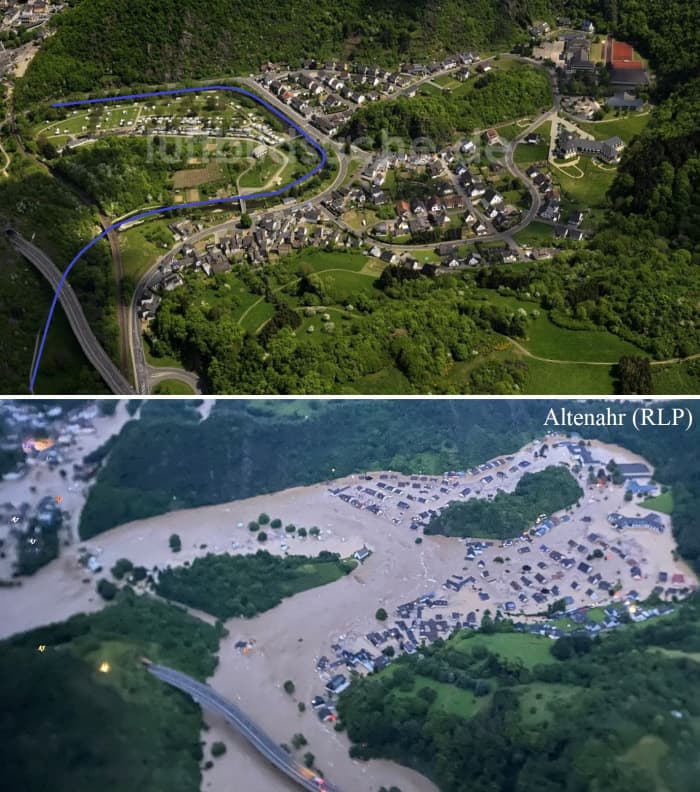 Les scènes de dévastation y sont catastrophiques. Dans le village de Schuld situé en Rhénanie-Palatinat (ouest du pays), la rivière Ahr s'est transformée en un véritable torrent. La puissance inouïe des flots a surpris tout le monde et emporté des maisons en soirée et nuit du 14 au 15 juillet 2021, faisant perdre la vie à de nombreux habitants. Dans ce secteur, la station de mesure a enregistré une élévation très rapide de 5 mètres du niveau de la rivière Ahr, avant de cesser de fonctionner. Lors de la dernière mesure, le niveau était déjà 2 mètres au dessus du record historique ! Le comparatif entre la situation habituelle et celle observée ce matin du 15 juillet 2021 fait froid dans le dos, montrant une élévation du niveau du cours d'eau de l'ordre de 7 à 8 mètres !
