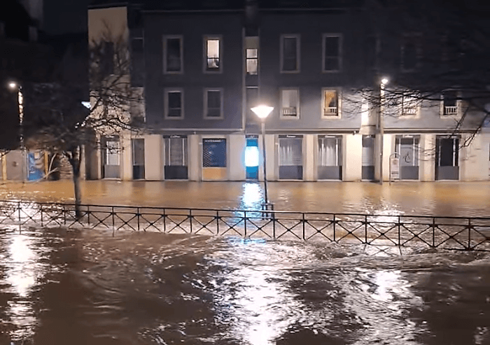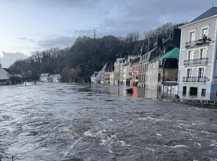 Un peu plus tôt, c'est la ville de Quimper qui fut parmi les premières à subir les crues. Le Steïr, affluent du fleuve Odet, a débordé dans une partie du centre-ville. Il faut dire que les cumuls de précipitations sont remarquables dans le secteur, qui a reçu une soixantaine de millimètres de pluie en 24 heures et qui dépasse la barre des 200 mm depuis le début du mois de janvier 2026 ! C'est la répétition de ces épisodes pluvieux qui cause la saturation des sols et le débordement des cours d'eau.