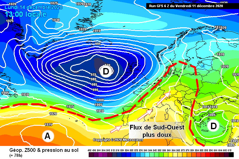 Schéma de la situation atmosphérique envisagée pour le lundi 14 décembre sur l'Ouest de l'Europe - Modèle GFS via météociel.fr