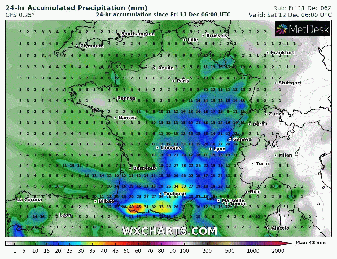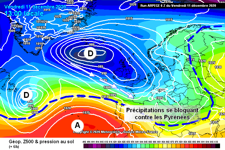 Les précipitations on en effet tendance à se bloquer contre les versants Nord reliefs des Pyrénées dans ce type de situation avec une succession de perturbations et/ou traînes actives sur cette région.