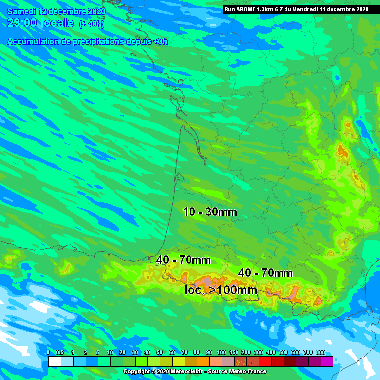 Cumuls de pluie attendus sur le Sud-Ouest du pays entre vendredi 11 et samedi 12 décembre - Modèle arome via météociel.fr